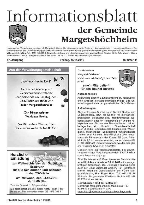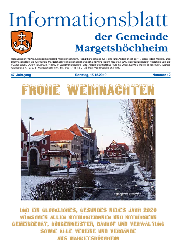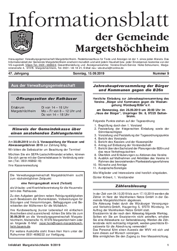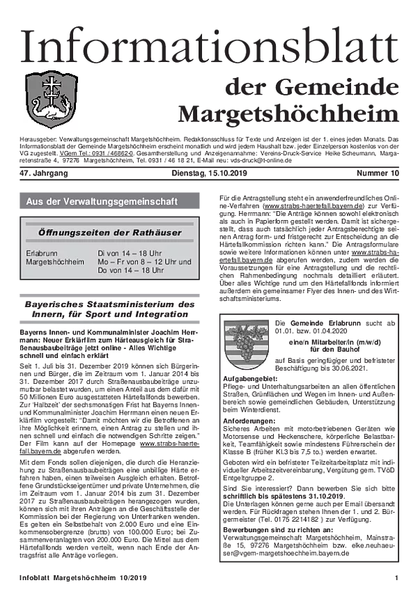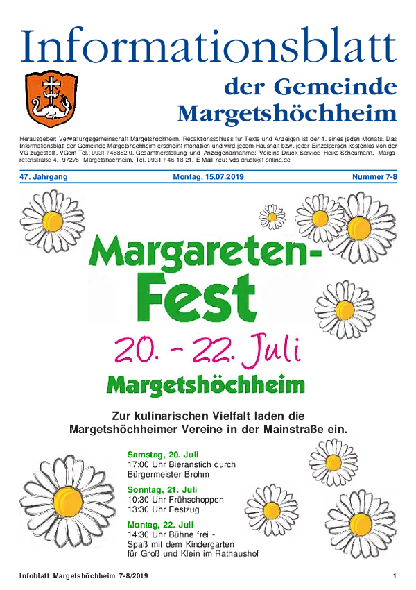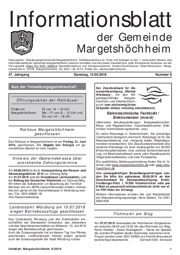 Das Informationsblatt der VGem Margetshöchheim erscheint jeweils zum letzten Freitag im Monat. Sollte es sich hierbei um einen gesetzlichen Feiertag handeln, so wird die Veröffentlichung um einen Tag (Donnerstag) vorverlegt. Dieses wird in den Gemeinden Margetshöchheim und Erlabrunn verteilt. Anzeigenschluss ist jeweils 15 Tage vor dem Erscheinungstermin. Das Informationsblatt erscheint ganzjährig. Weitere Informationen zur Einsendung und Preisen finden Sie untenstehend. Veröffentlichungen im Informationsblatt müssen der nachstehenden Richtlinie entsprechen.