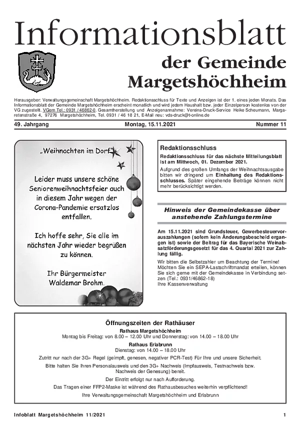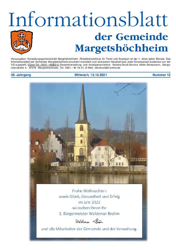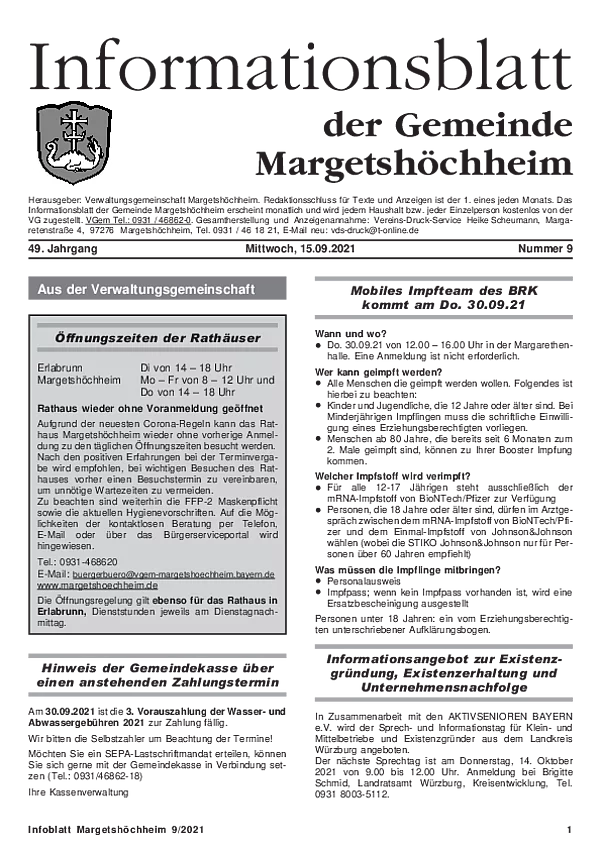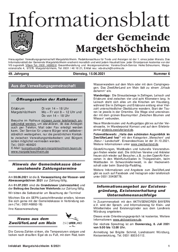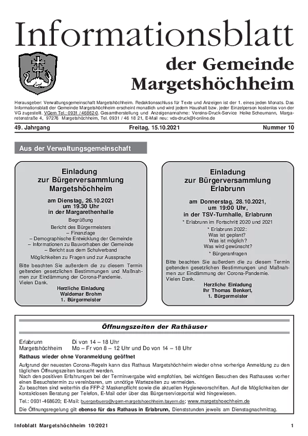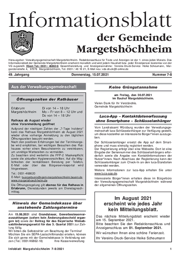 Das Informationsblatt der VGem Margetshöchheim erscheint jeweils zum letzten Freitag im Monat. Sollte es sich hierbei um einen gesetzlichen Feiertag handeln, so wird die Veröffentlichung um einen Tag (Donnerstag) vorverlegt. Dieses wird in den Gemeinden Margetshöchheim und Erlabrunn verteilt. Anzeigenschluss ist jeweils 15 Tage vor dem Erscheinungstermin. Das Informationsblatt erscheint ganzjährig. Weitere Informationen zur Einsendung und Preisen finden Sie untenstehend. Veröffentlichungen im Informationsblatt müssen der nachstehenden Richtlinie entsprechen.
