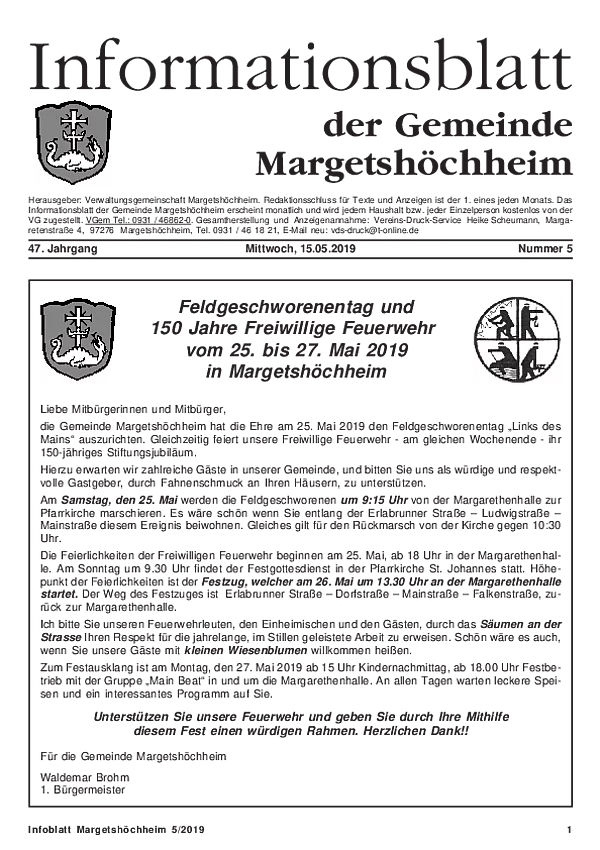 Das Informationsblatt der VGem Margetshöchheim erscheint jeweils zum letzten Freitag im Monat. Sollte es sich hierbei um einen gesetzlichen Feiertag handeln, so wird die Veröffentlichung um einen Tag (Donnerstag) vorverlegt. Dieses wird in den Gemeinden Margetshöchheim und Erlabrunn verteilt. Anzeigenschluss ist jeweils 15 Tage vor dem Erscheinungstermin. Das Informationsblatt erscheint ganzjährig. Weitere Informationen zur Einsendung und Preisen finden Sie untenstehend. Veröffentlichungen im Informationsblatt müssen der nachstehenden Richtlinie entsprechen.