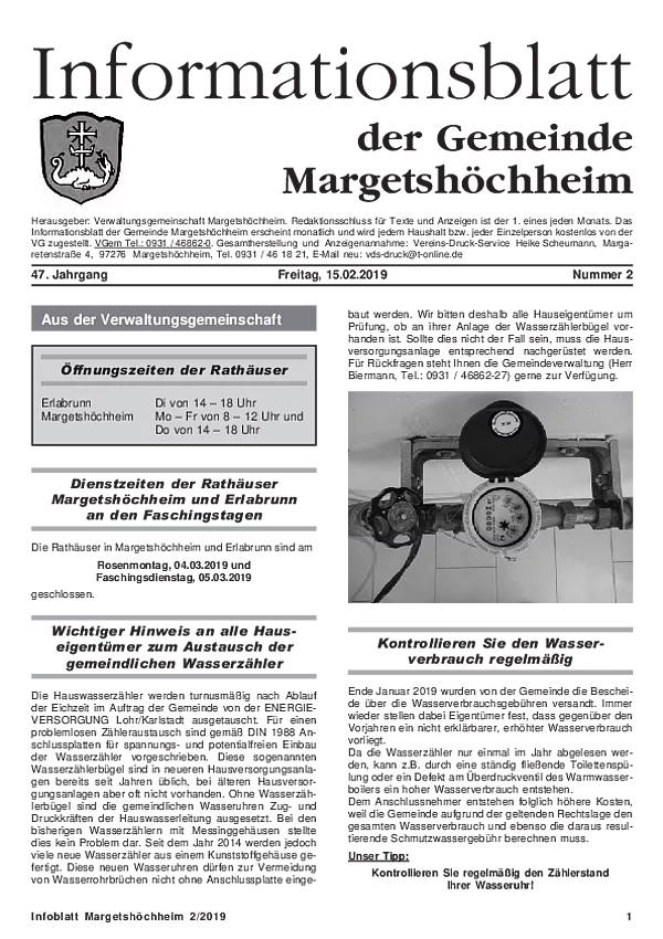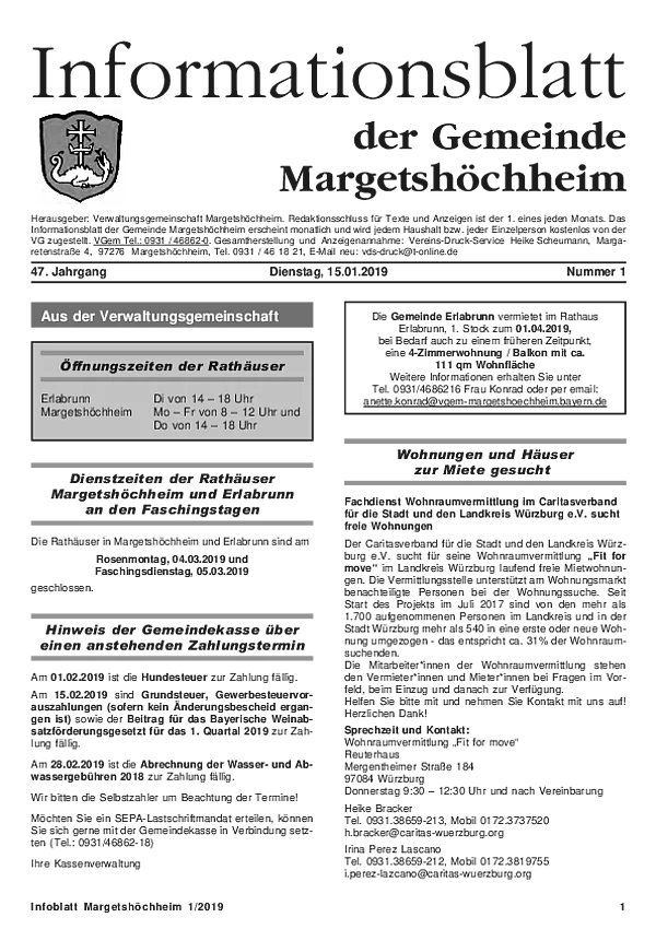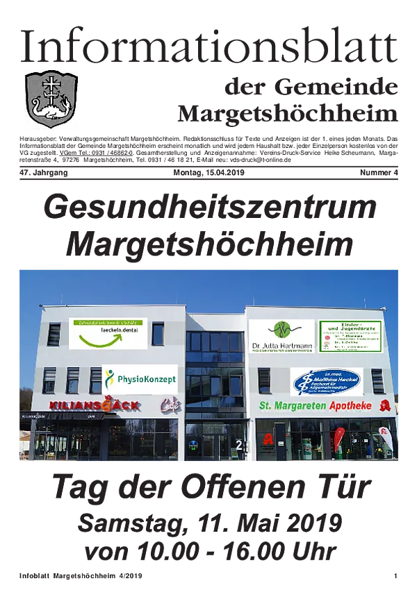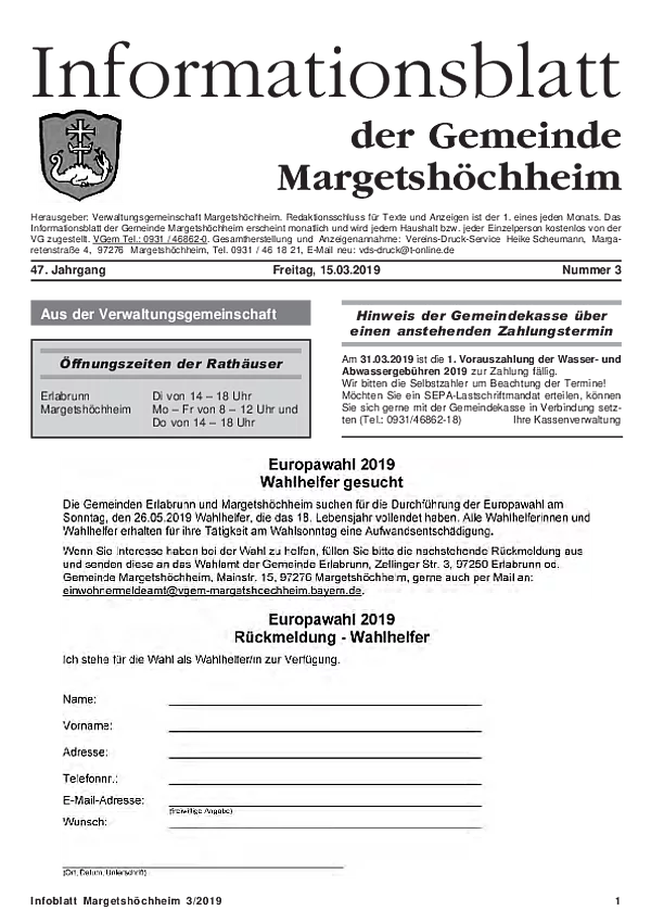 Das Informationsblatt der VGem Margetshöchheim erscheint jeweils zum letzten Freitag im Monat. Sollte es sich hierbei um einen gesetzlichen Feiertag handeln, so wird die Veröffentlichung um einen Tag (Donnerstag) vorverlegt. Dieses wird in den Gemeinden Margetshöchheim und Erlabrunn verteilt. Anzeigenschluss ist jeweils 15 Tage vor dem Erscheinungstermin. Das Informationsblatt erscheint ganzjährig. Weitere Informationen zur Einsendung und Preisen finden Sie untenstehend. Veröffentlichungen im Informationsblatt müssen der nachstehenden Richtlinie entsprechen.