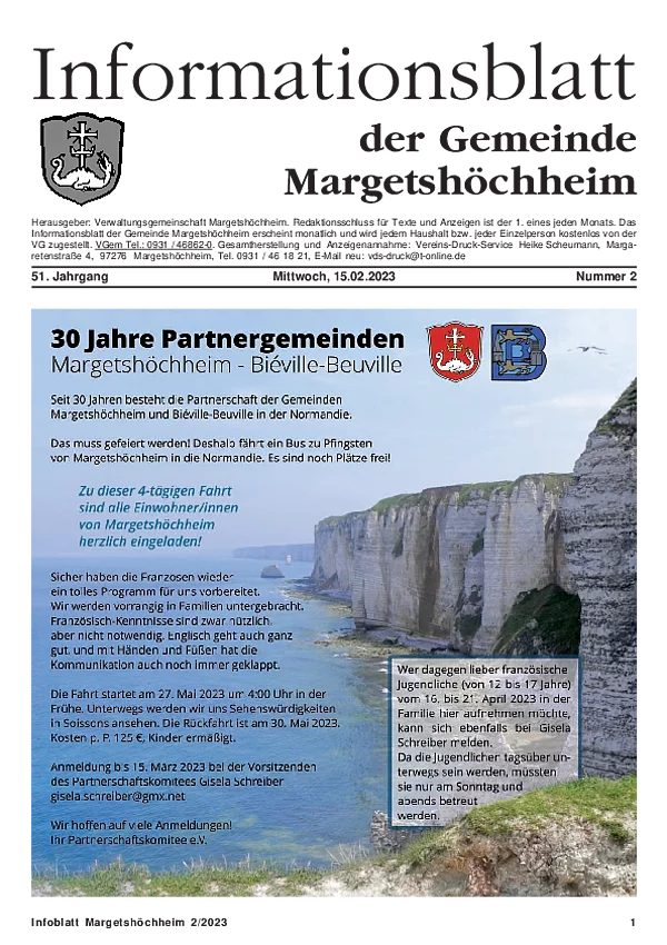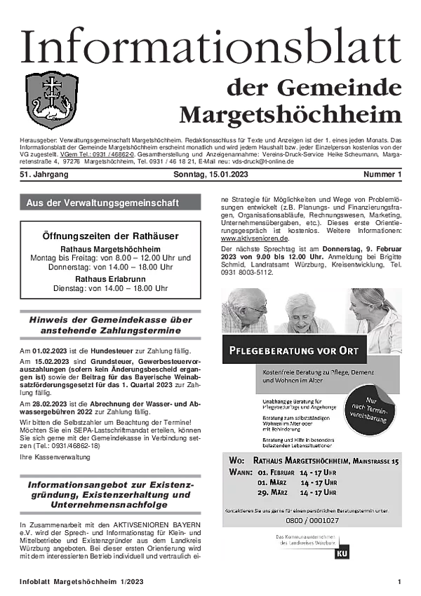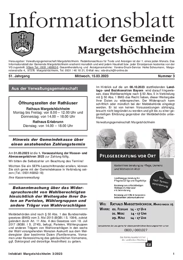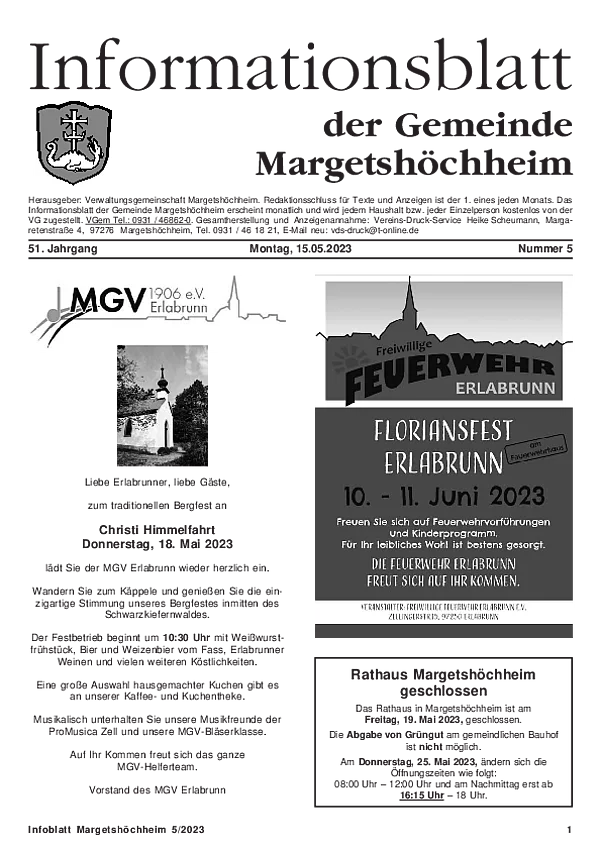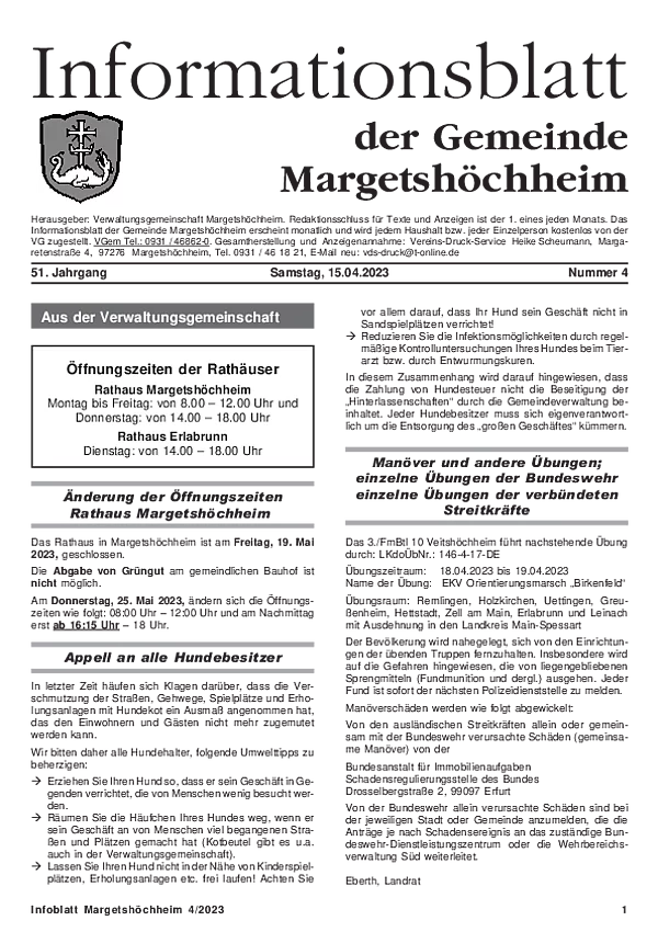 Das Informationsblatt der VGem Margetshöchheim erscheint jeweils zum letzten Freitag im Monat. Sollte es sich hierbei um einen gesetzlichen Feiertag handeln, so wird die Veröffentlichung um einen Tag (Donnerstag) vorverlegt. Dieses wird in den Gemeinden Margetshöchheim und Erlabrunn verteilt. Anzeigenschluss ist jeweils 15 Tage vor dem Erscheinungstermin. Das Informationsblatt erscheint ganzjährig. Weitere Informationen zur Einsendung und Preisen finden Sie untenstehend. Veröffentlichungen im Informationsblatt müssen der nachstehenden Richtlinie entsprechen.