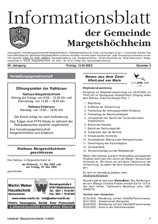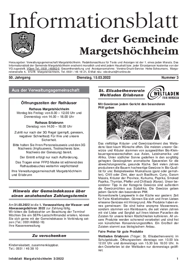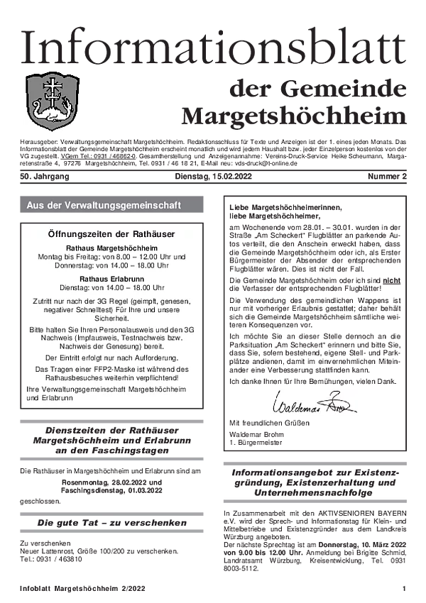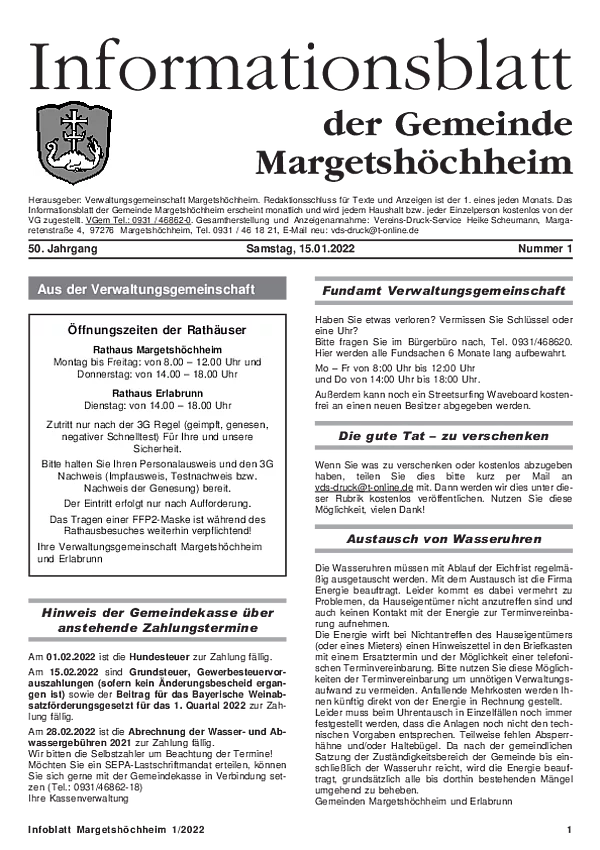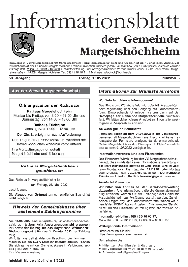 Das Informationsblatt der VGem Margetshöchheim erscheint jeweils zum letzten Freitag im Monat. Sollte es sich hierbei um einen gesetzlichen Feiertag handeln, so wird die Veröffentlichung um einen Tag (Donnerstag) vorverlegt. Dieses wird in den Gemeinden Margetshöchheim und Erlabrunn verteilt. Anzeigenschluss ist jeweils 15 Tage vor dem Erscheinungstermin. Das Informationsblatt erscheint ganzjährig. Weitere Informationen zur Einsendung und Preisen finden Sie untenstehend. Veröffentlichungen im Informationsblatt müssen der nachstehenden Richtlinie entsprechen.