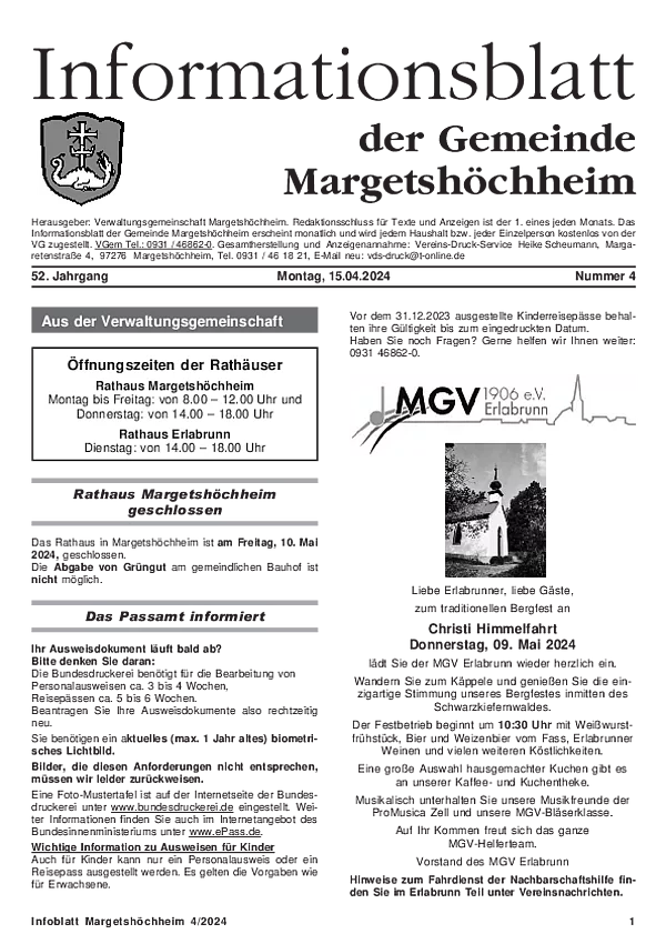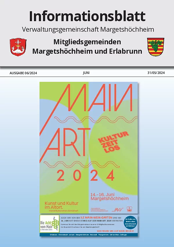 Das Informationsblatt der VGem Margetshöchheim erscheint jeweils zum letzten Freitag im Monat. Sollte es sich hierbei um einen gesetzlichen Feiertag handeln, so wird die Veröffentlichung um einen Tag (Donnerstag) vorverlegt. Dieses wird in den Gemeinden Margetshöchheim und Erlabrunn verteilt. Anzeigenschluss ist jeweils 15 Tage vor dem Erscheinungstermin. Das Informationsblatt erscheint ganzjährig. Weitere Informationen zur Einsendung und Preisen finden Sie untenstehend. Veröffentlichungen im Informationsblatt müssen der nachstehenden Richtlinie entsprechen.