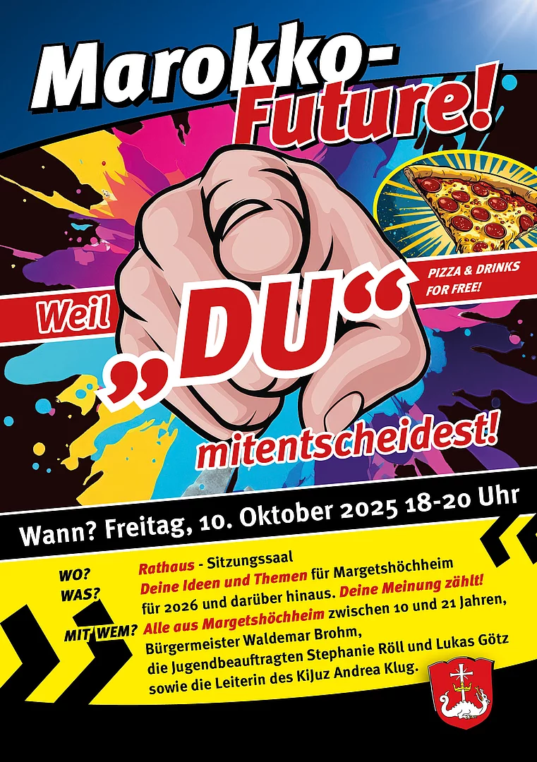 Deine Ideen und Themen für Margetshöchheim für 2026 und darüber hinaus. Deine Meinung zählt. Angesprochen werden alle aus Margetshöchheim zwischen 10 und 21 Jahren, kommt vorbei!